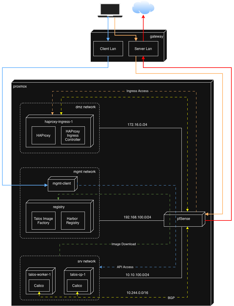 - MGMT - is used for redirect necessary registry traffic and Talos internal image factory functionality. It takes care that Talos has no need to connect to the internet to get the needed images. Furthermore, the management client is installed here to have a convenient place for installation, both through cli and browser gui